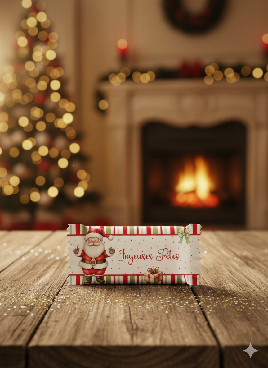 Chaque gourmandise est emballée individuellement dans un décor illustrant la magie de Noël : Père Noël, renne, bonhomme de neige, couronne, ou pingouin.